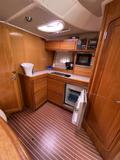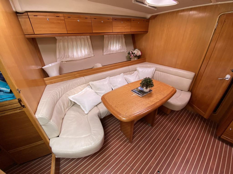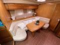 * U-shaped saloon sofa and table next to it and galley on opposite side