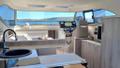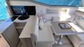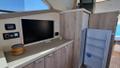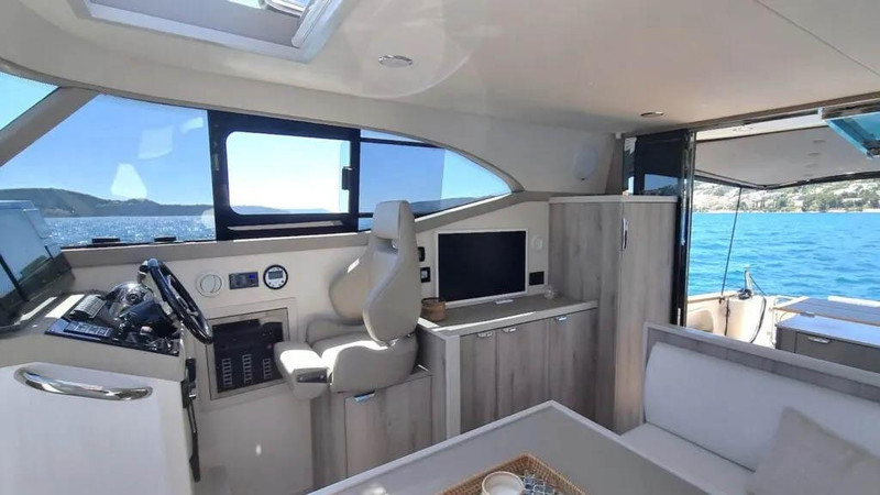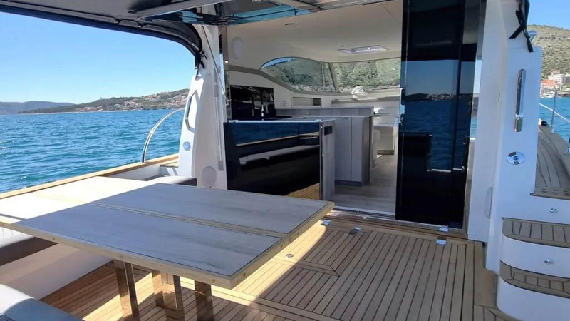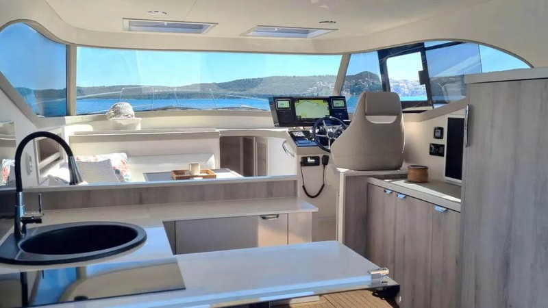 A modernly equipped salon and wheelhouse with side door and a fully equipped kitchen located at the entrance to the outer cockpit, with an open folding kitchen window that perfectly combines the salon and the outer cockpit into one special unit.