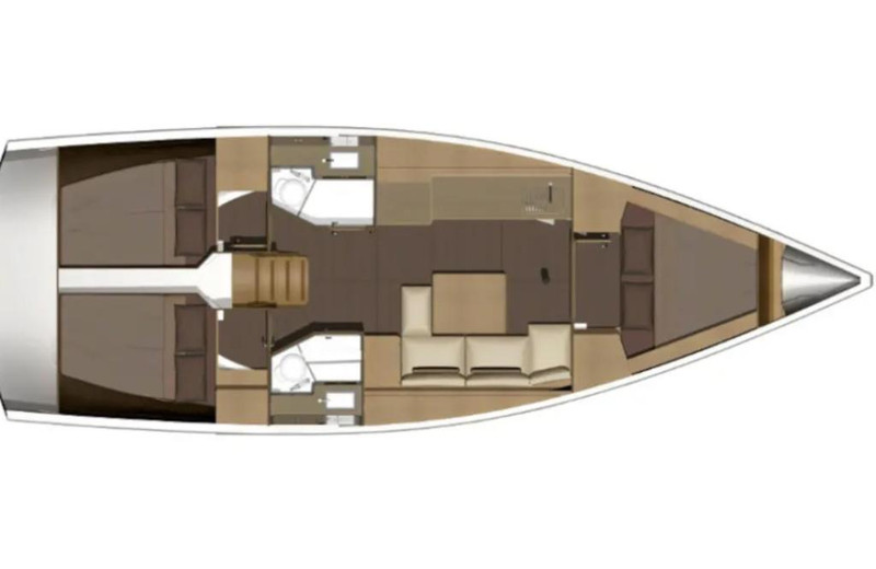 Layout: 3 cabins, 6+2 berths, 2 head.