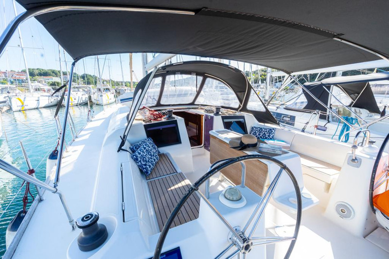 * Portside cockpit seat with foldable part can be extended to large sun berth