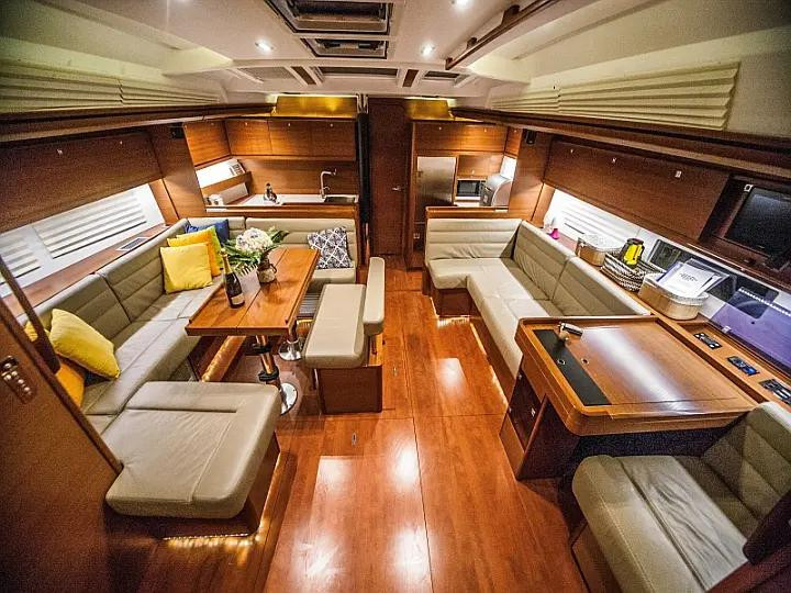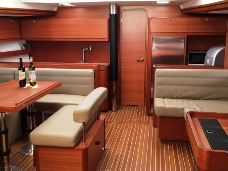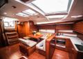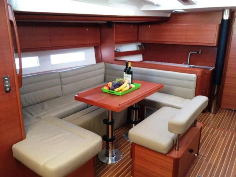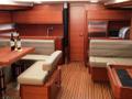 * U-shaped saloon settee and oposite straight shaped seating bank with saloon table that can be converted to 2 extra berths + Oposite side L-shaped settee