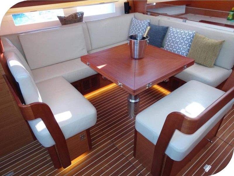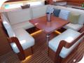 * U-shaped saloon settee and oposite straight shaped seating bank with saloon table that can be converted to 2 extra berths + Oposite side L-shaped settee