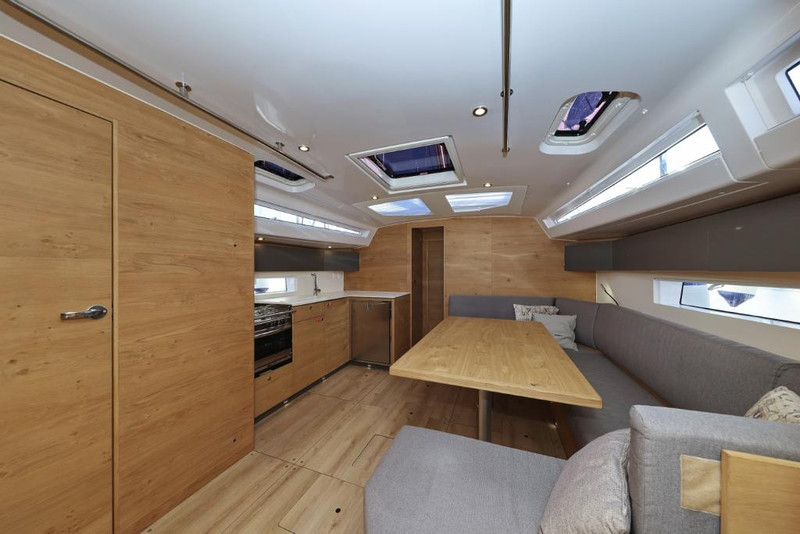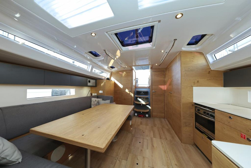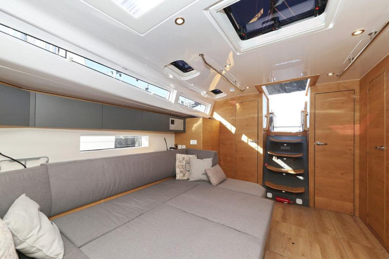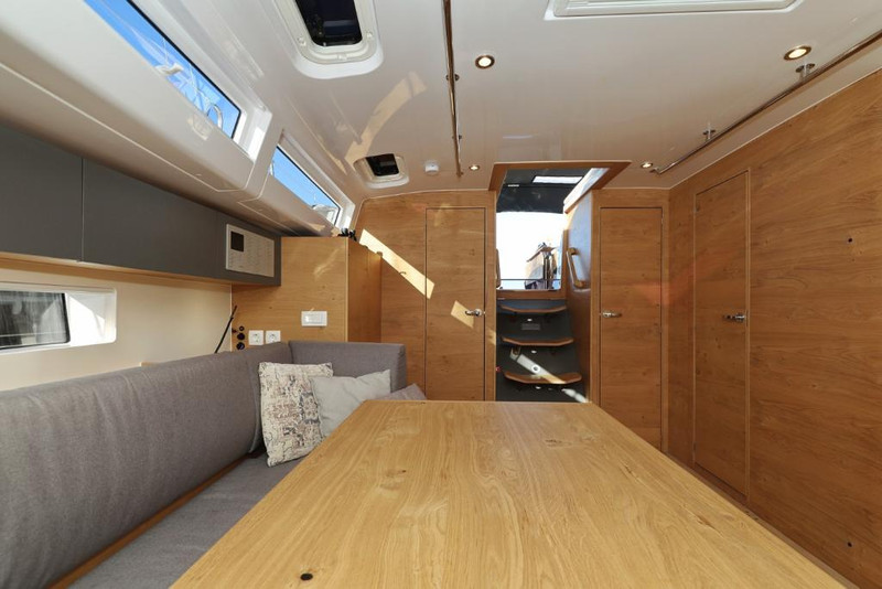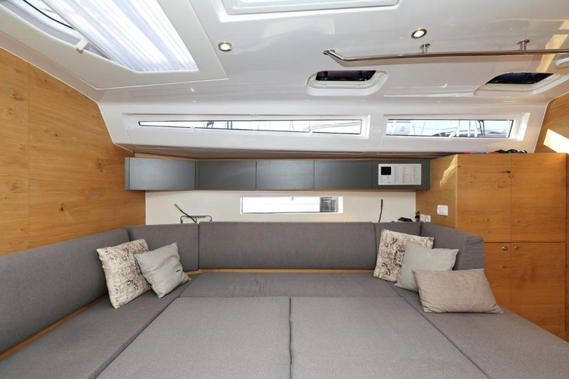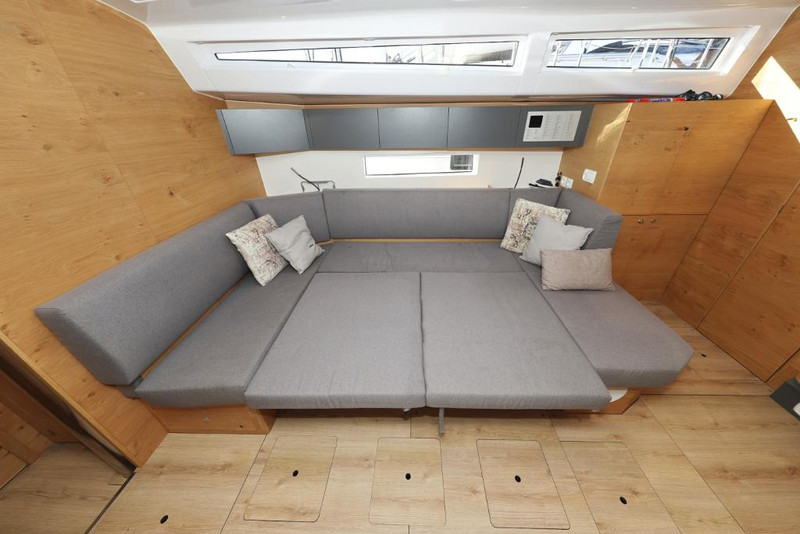 * U-shaped saloon settee (cotton upholstery) with saloon table that can be converted to 2 extra berths