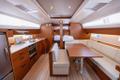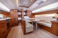 *L-shaped saloon settee with saloon table and opposite straight shaped seating bank (table can be lowered and converted into 2 extra berths)