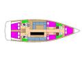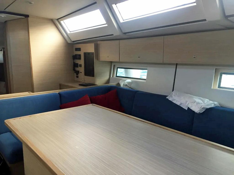 There are two tables in saloon giving the possibility of splitting a large charter crew into two groups. The extensive specification includes lots of refrigerators volume, air-conditioning and a Yanmar 110 HP engine.