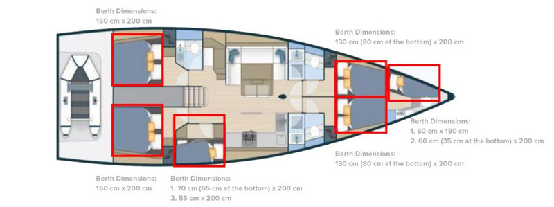 5+1 (crew) cabins, 10+2+1 berths, 3+1 (crew) heads.